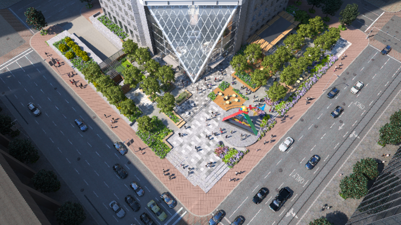 The currently underutilized plaza area will be transformed into a vibrant urban garden featuring a variety of seating areas to enjoy, featuring increased green space, an expanded canopy, and more connections from the outdoors to the building. With the addition of retail to the lobby, the plaza will also be activated by new food and beverage for tenants and visitors. The plaza space will allow for outdoor meetings and meals, collaborative sessions with colleagues, and more secluded spaces for contemplative time. The largest Joan Miró sculpture ever commissioned, entitled "Personage and Birds” will remain onsite.