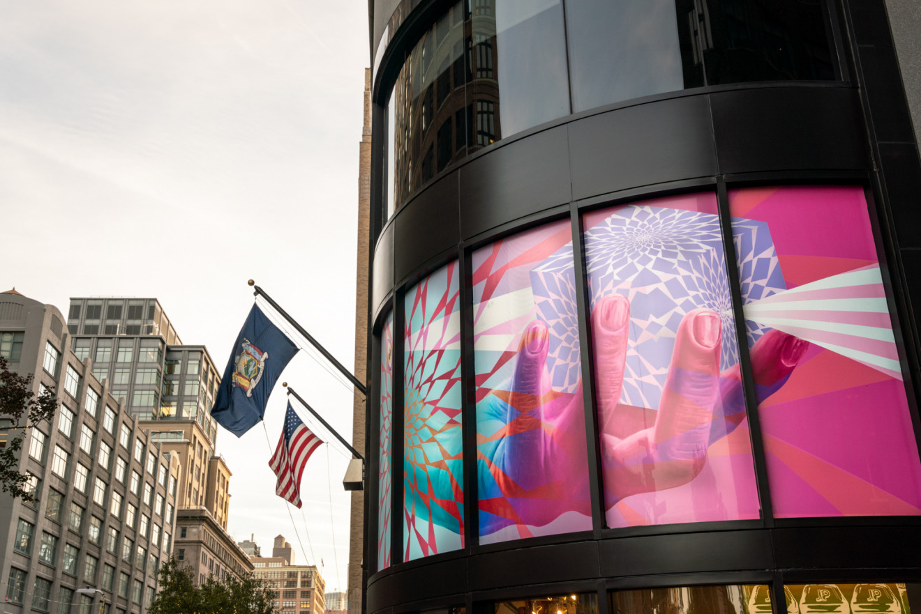 The mural is designed to instill a sense of hope and unity as New York heals and recovers from the effects of a global pandemic. In this site-specific mural comprised of 40 individual panels, the artists use dynamic geometric colors, shapes and patterns to represent what they call “the natural and essential elements that forge the foundation for holistic living within our urban jungle: a vigorous, ever-changing landscape like the shimmer of sunlight in the sky.” The flying fauna represent a higher perspective, where the vision of the future of creativity nests. A hand holds a cubed prism, focusing and shining the light and the vision. “The cube is a metaphor for the square in Hudson Square, the square in the third dimension - and a reminder that the vision for the future is in our hands” said Artist Gera Lozano.