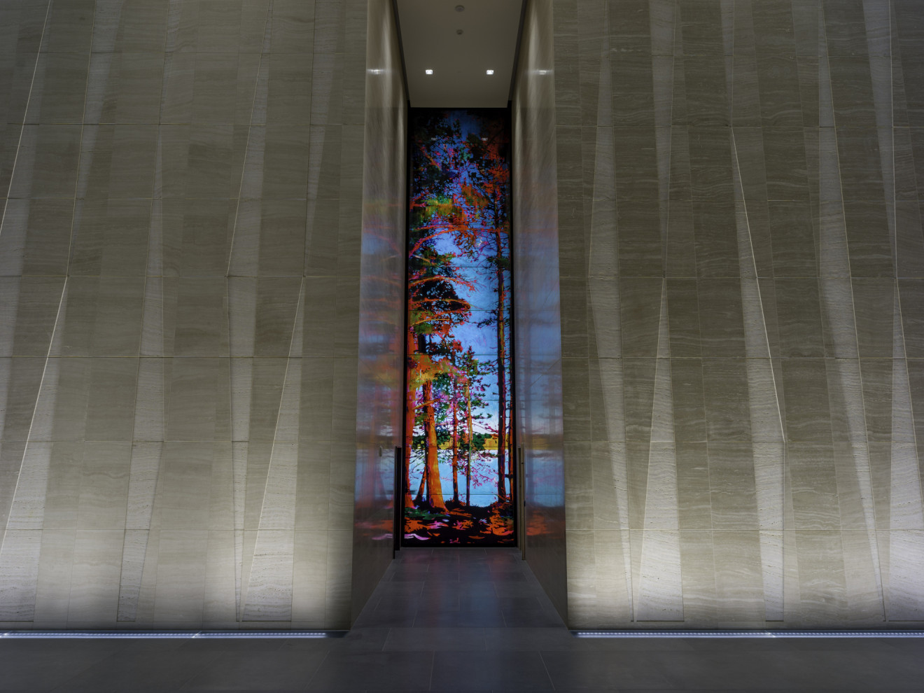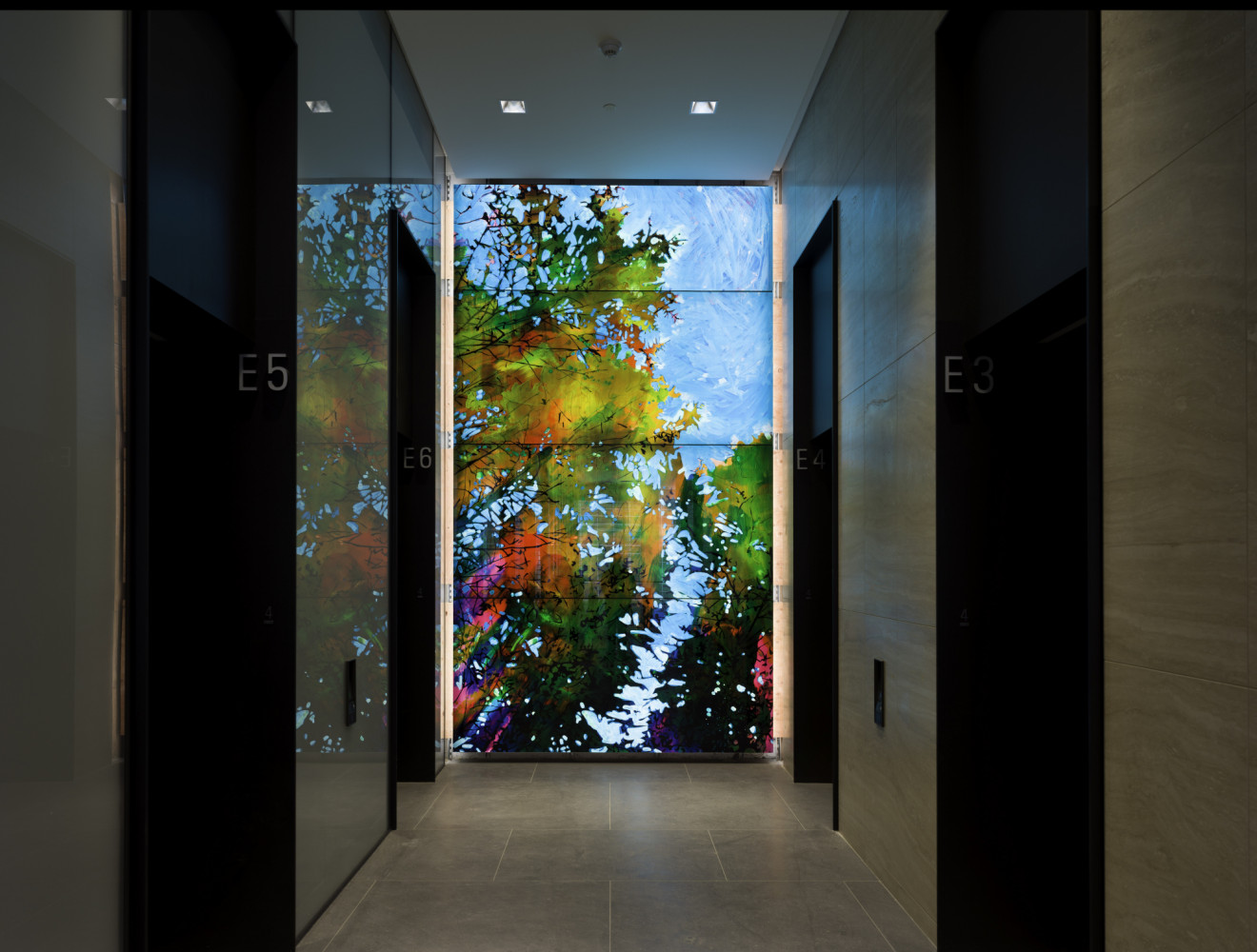 Everything in the 75' high lobby emphasizes the verticalâtall elevator surrounds in dark bronze, four-story columns, the tree-like stoneworkâand draws the eye up. Fittingly, the artwork also reaches to the sky. Integrated into the recess of the six elevator bays or corridorsâwhere the ceiling drops to a still impressive 36ââare 36â high x 9â wide softly backlit glass panels depicting tall trees in a watery setting. The saturated colors and animated brushstrokes are appreciated close-up. Glimpses of the artworkâas tall slivers of color interrupted by stoneâcan also be appreciated by passers-by on the street.