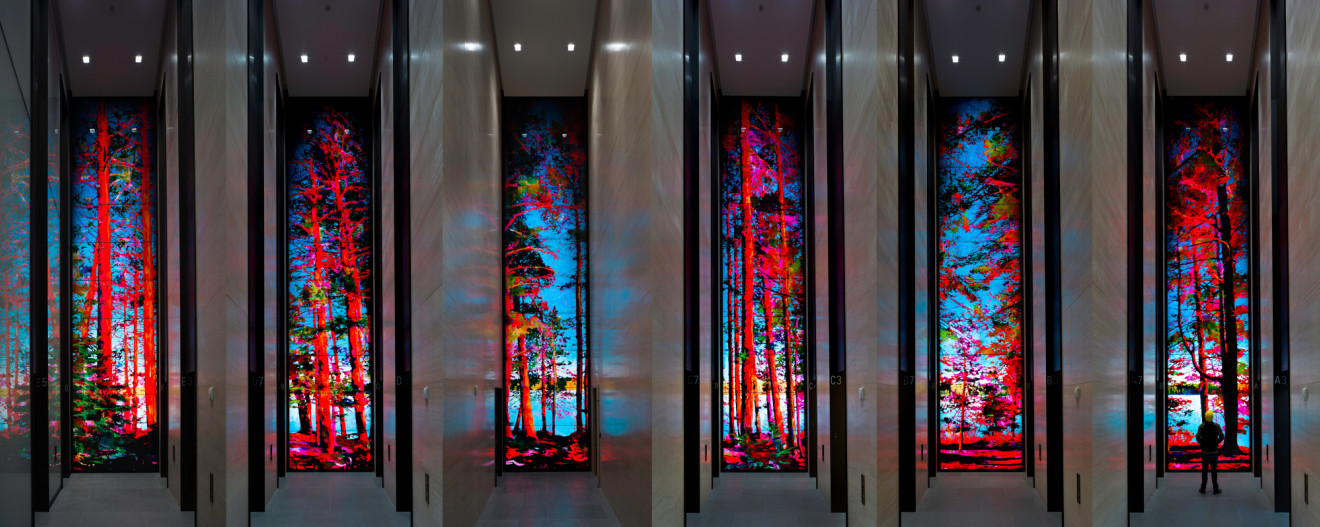 âThe lobby has a tree-like structure and there is this sense that the repetitive forms of these super tall trees are holding up the building,â says Driscoll. Echoing familiar Ontario forest scenes of red pine and cedars, are luminous panels of red, cyan, magenta, orange, wisps of green with dark deep shadows.