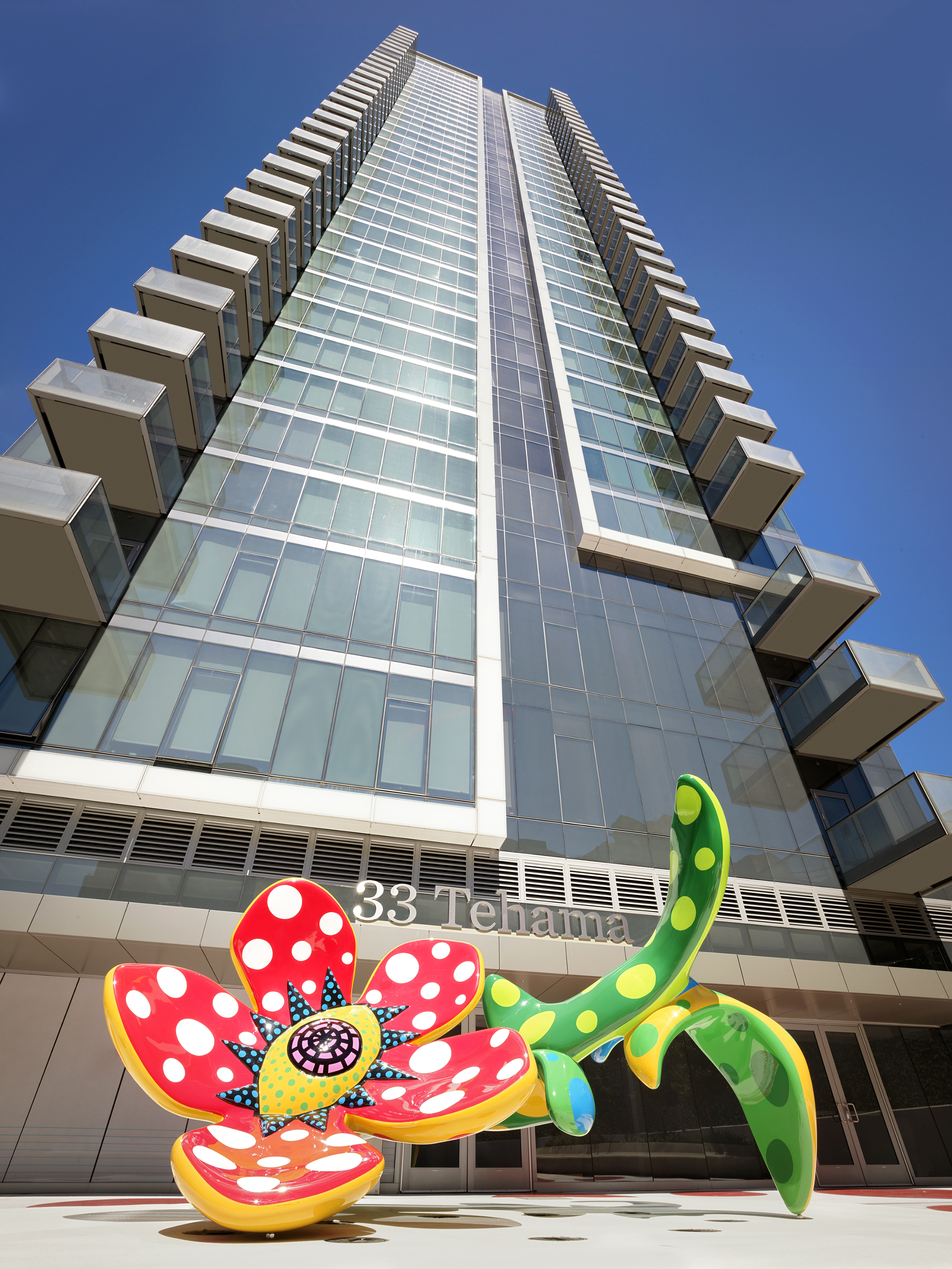 Designed by Arquitectonica, 33 Tehama offers 403 luxury urban-style residences in a 35-story building and features a best-in-class amenity package, including a wellness spa, fitness center, clubroom, rooftop solarium, outdoor terrace, work space, and future ground-floor retail/art space. The complex is surrounded on two sides by Oscar Park and is situated one block from the Transbay Transit Center. Additionally, the building features a sculpture by world-renowned, Japanese contemporary artist Yayoi Kusama, titled Flowers That Bloom at Midnight that is displayed in the plaza outside the tower lobby for the enjoyment of residents and the public.