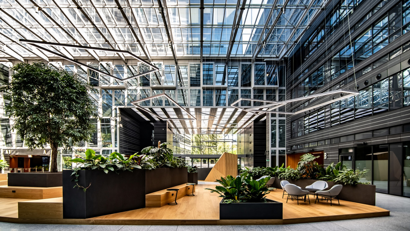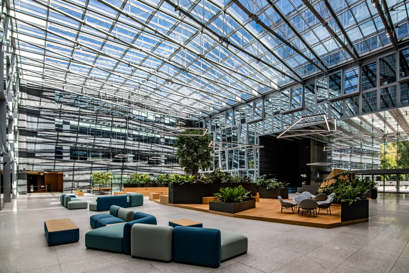 Wola Center is a flagship office building located in Warsaw's Wola district. Thanks to a modern lobby, a system of visual information and common spaces, it provides excellent appeal and comfort for its tenants and guests. In the atrium there is a reception desk and a coworking space, as well an area for relaxation surrounded by natural greenery and a several-meter-high tree located in the lobby.