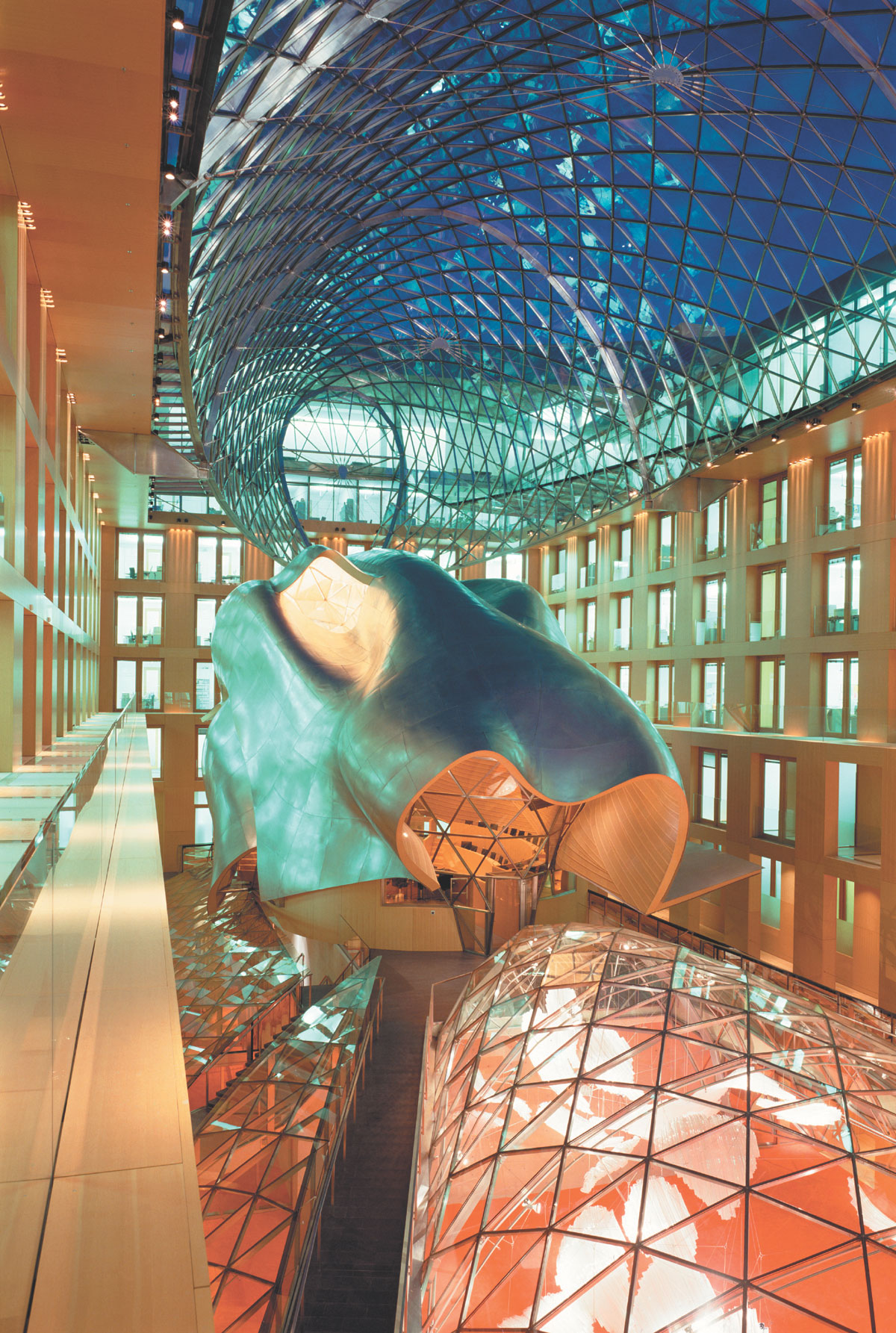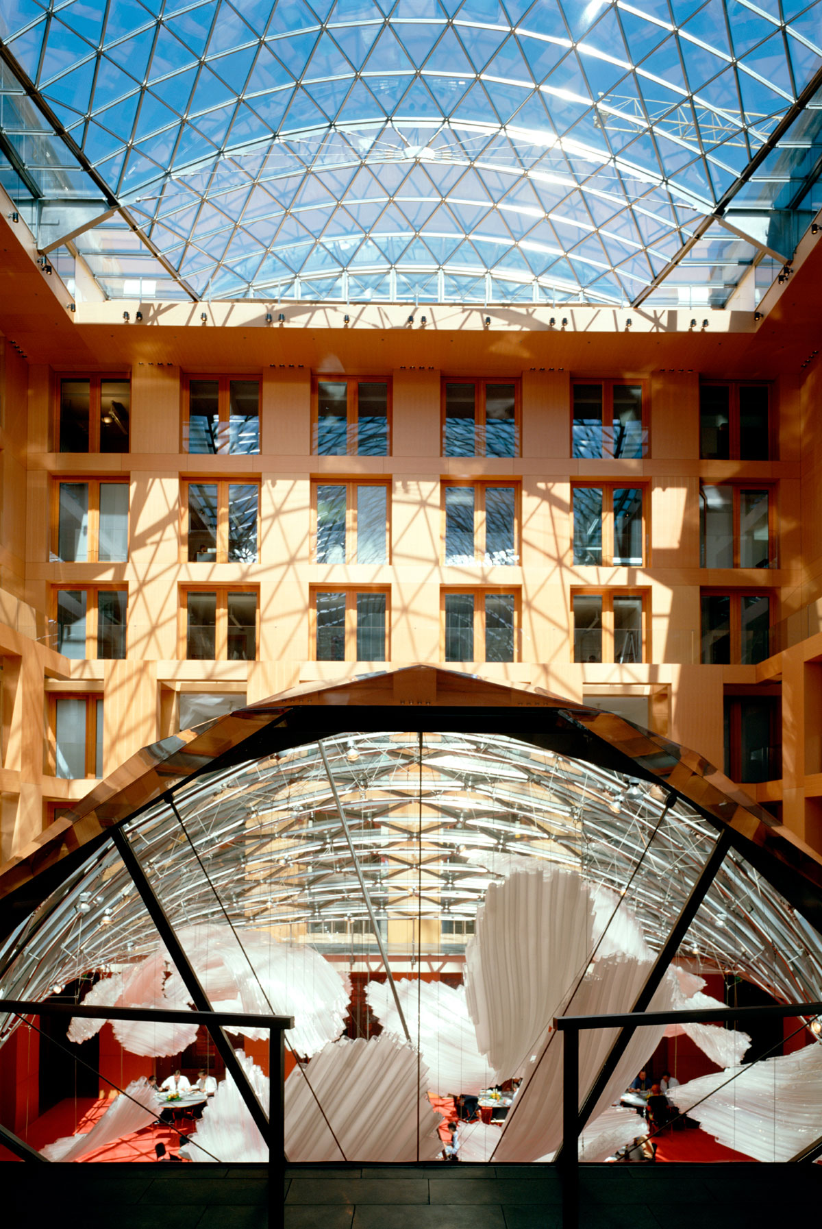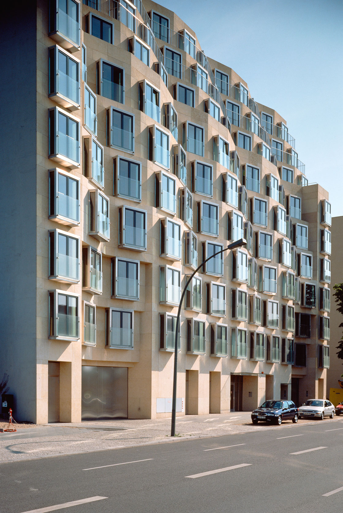 Completed in June 1999, DZ Bank is a 215,000-square-foot multi-use center that includes a five-story office building with a conference center and a nine-story luxury condominium building. The development is located on a 1.2-acre site near Brandenburg Gate and adjacent to the future U.S. Embassy. DZ Bank features a large skylit atrium in the office building. A three-dimensional curved fire wall and a smaller atrium separate the office building/conference area from the condominium. The exterior of the building is clad in a yellow Italian limestone (Pietra di Vincenza) and features deeply recessed windows.