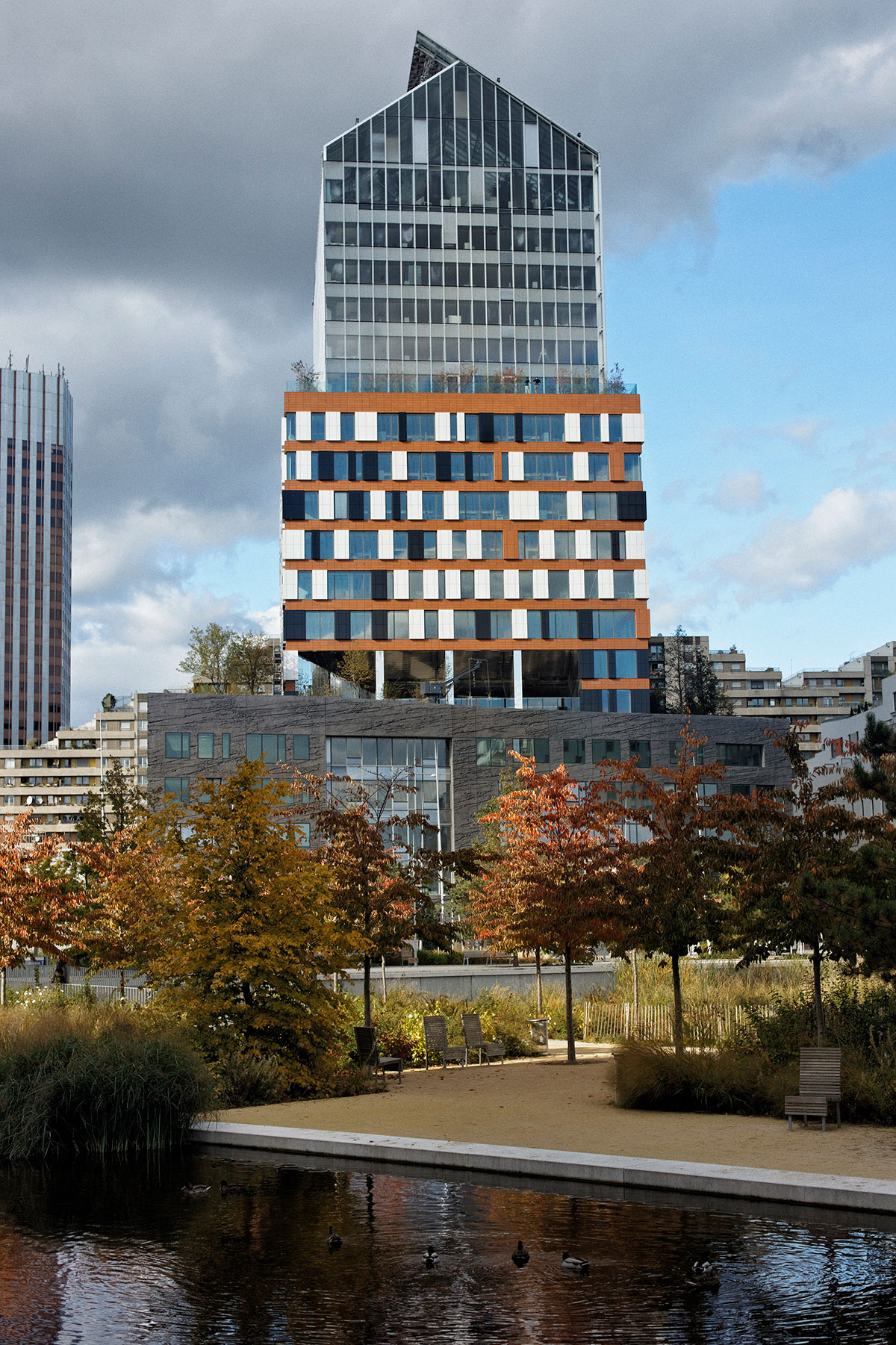 Horizons Tower, located just outside Paris on the Seine in Boulogne Billancourt, is a 19-story, 392,506-square-foot office building designed by famed French architect Jean Nouvel. The building also features a four-level parking garage with 610 spaces. The exterior façade consists of three materials, sculpted concrete, enameled ceramic and glass, which breaks from the usual design of the traditional office building. The landscaping surrounding the building ensures continuity with the surrounding environment, most notably Trapeze Park, the Paris skyline and the hills of Meudon.