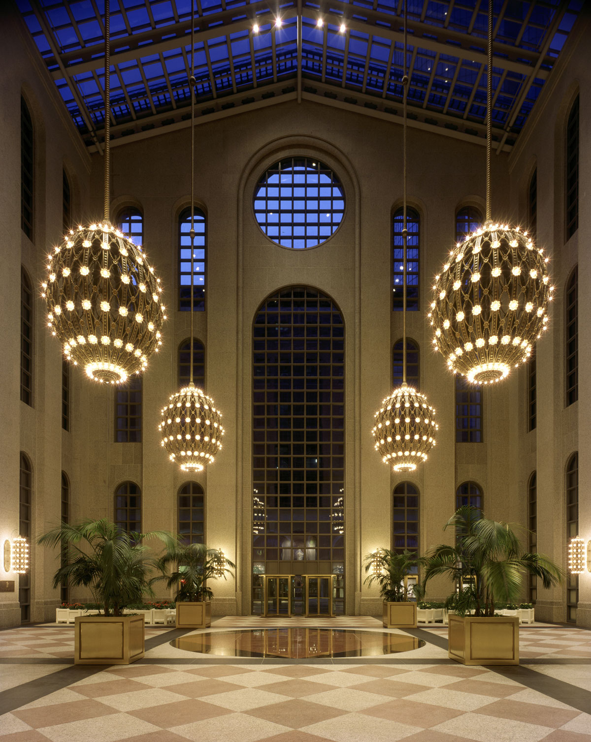 One Ninety One Peachtree is a 50-story office tower located in downtown Atlanta.  Designed by Johnson and Burgee, the theme of the tower represents a renaissance of the grand skyscraper tradition of the early 1900s.  In response to the long rectangular configuration of the through-block site, the architects articulated the building’s form to create the impression of two separate but connected towers, which create a constantly changing silhouette as the tower is viewed from different angles.  From the east and west, One Ninety One Peachtree Tower appears as a single, slender shaft of granite, and from the north and south, as two twin tower-like forms linked by a recessed plane.  Each tower culminates in seven full stories of interwoven arches and curving domes to a final crown of columns, which are illuminated at night.  The tower was completed in 1991.